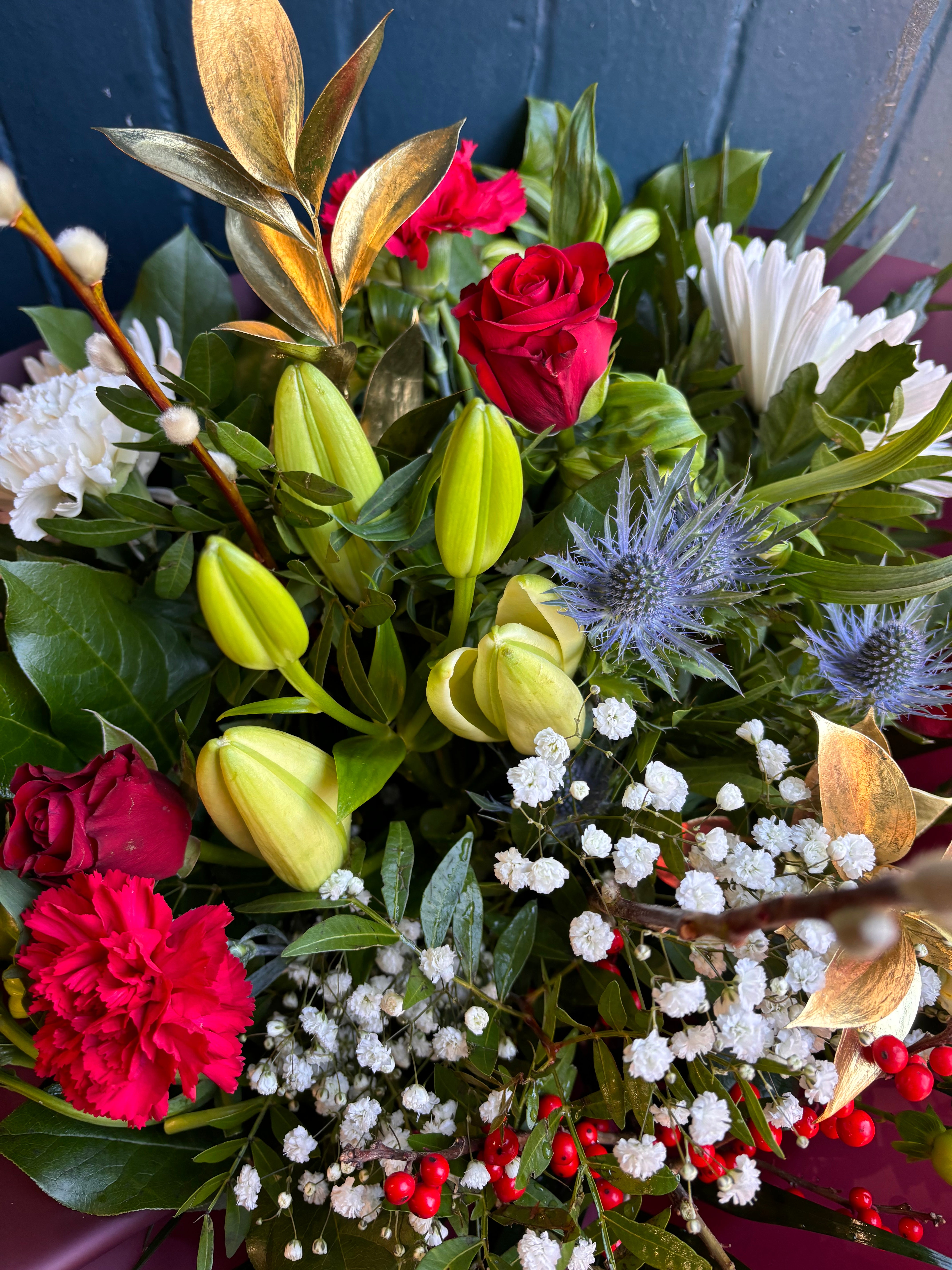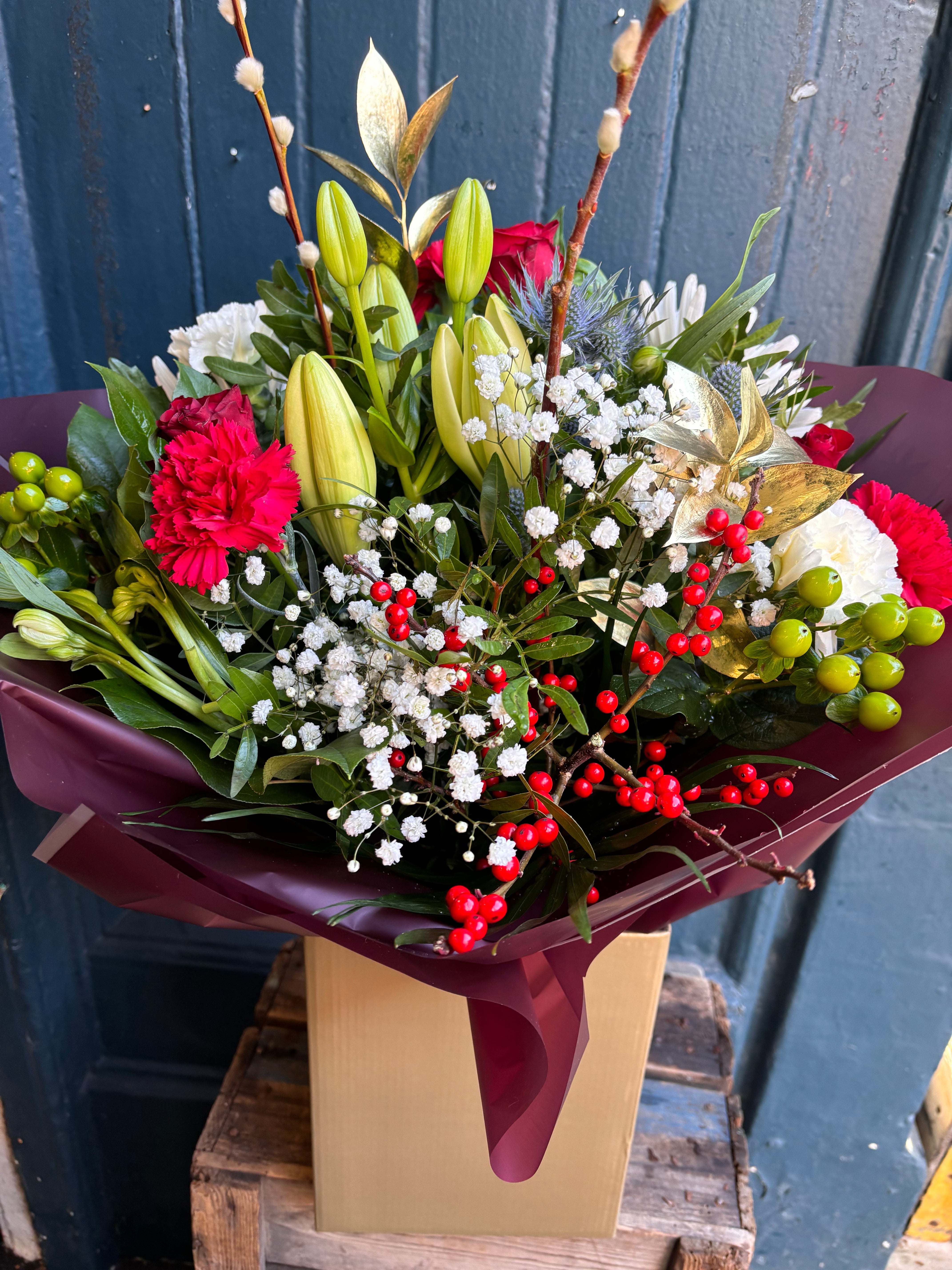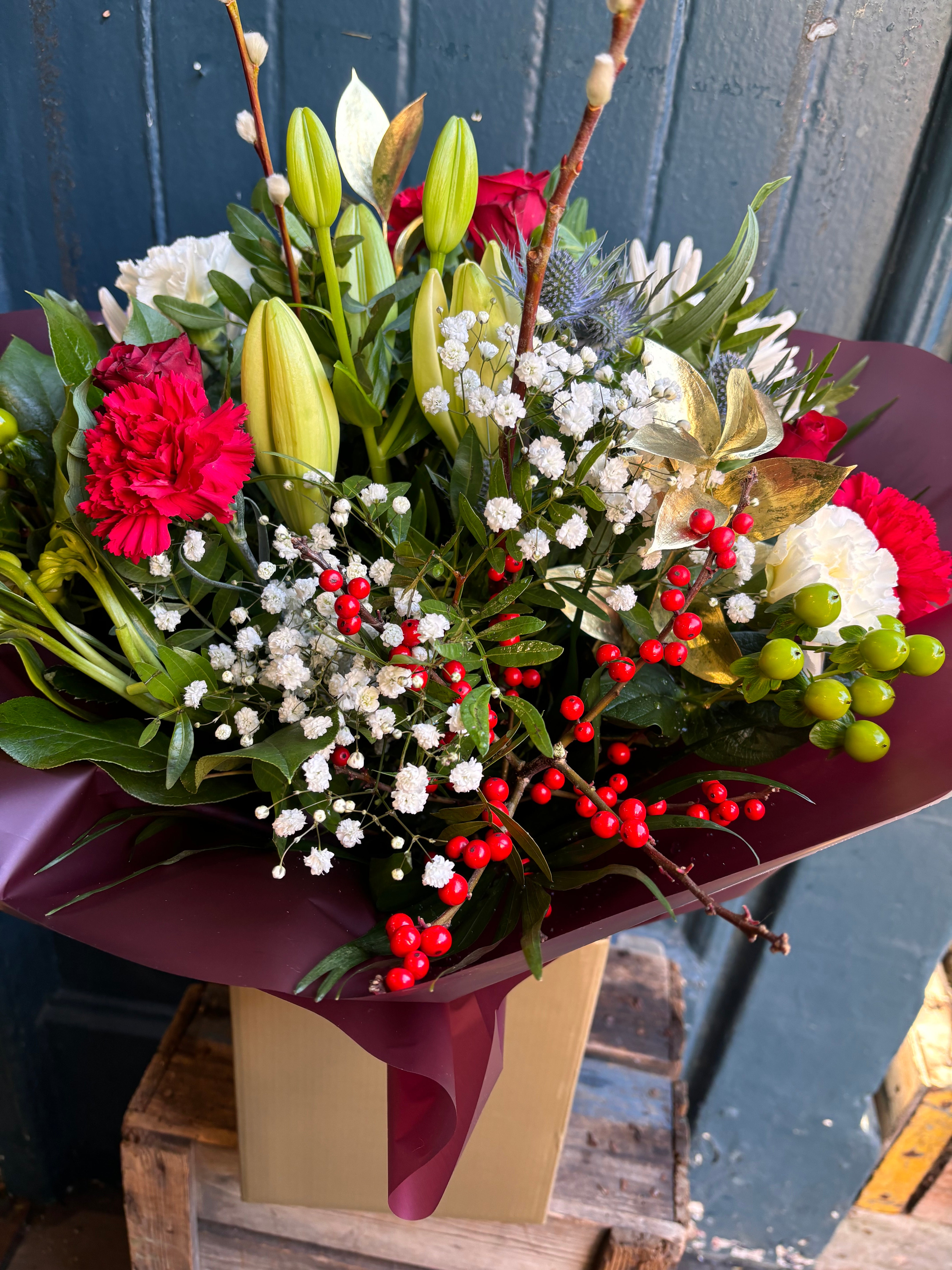 The best way to spread Christmas cheer, is to order flowers sent from here! A beautiful free standing aqua pack bouquet is filled with Christmas cheer - Red ilex berries, red germini and red roses complimented with seasonal foliage and pretty snow like gypsophila. Arranged and sent with lots of Christmas spirit and love! Xox
